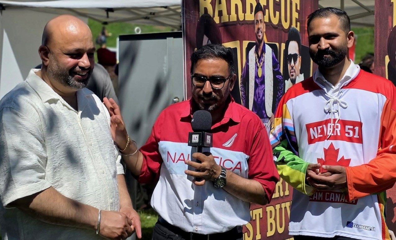 ਕੈਲਗਰੀ ਵਿਚ ਕੈਨੇਡਾ ਡੇਅ ਮੌਕੇ ਉਘੇ ਬਿਜਨਸਮੈਨ ਕਰਮਪਾਲ ਸਿੱਧੂ ਕੈਲਗਰੀ ਸਟੈਂਪੀਡ ਮੌਕੇ 6 ਜੁਲਾਈ ਨੂੰ ਕਰਵਾਏ ਜਾ ਰਹੇ ਸਟੈਂਪੀਡ ਬਾਰਬੀਕਿਊ ਤੇ ਸੰਗੀਤਕ ਪ੍ਰੋਗਰਾਮ ਬਾਰੇ ਜਾਣਕਾਰੀ ਦਿੰਦੇ ਹੋਏ। ਨਾਲ ਐਮ ਐਲ ਏ ਗੁਰਿੰਦਰ ਬਰਾੜ।