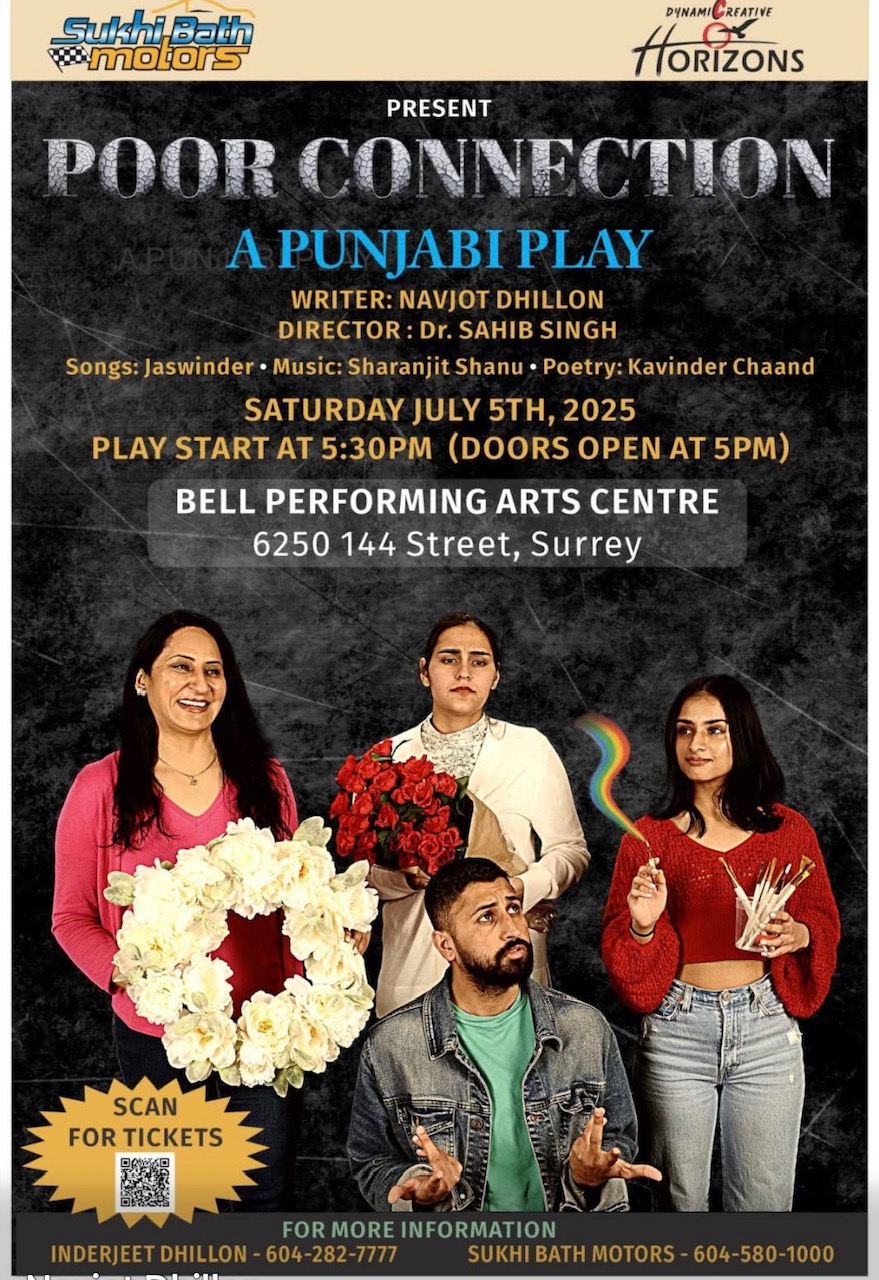 ਸਰੀ- ਉਘੀ ਰੇਡੀਓ ਤੇ ਟੀਵੀ ਹੋਸਟ ਨਵਜੋਤ ਢਿੱਲੋਂ ਦੁਆਰਾ ਲਿਖਿਆ ਤੇ ਪ੍ਰਸਿੱਧ ਨਾਟਕਕਾਰ ਡਾ ਸਾਹਿਬ ਸਿੰਘ ਦੁਆਰਾ ਨਿਰਦੇਸ਼ਿਤ ਨਾਟਕ ”ਪੂਅਰ ਕੁਨੈਕਸ਼ਨ” 5 ਜੁਲਾਈ ਦਿਨ ਸ਼ਨੀਵਾਰ ਨੂੰ ਸਰੀ ਦੇ ਬੈਲ ਪ੍ਰਫਾਰਮੈਂਸ ਸੈਂਟਰ 6050, 144 ਸਟਰੀਟ ਸਰੀ ਵਿਖੇ ਖੇਡਿਆ ਜਾ ਰਿਹਾ ਹੈ। ਸੁੱਖੀ ਬਾਠ ਮੋਟਰਜ਼ ਅਤੇ ਡਾਇਨੈਮਿਕ ਕਰੀਏਟਿਵ ਹੌਰਾਈਜ਼ਨਸ (ਡੀ ਸੀ ਐਚ) ਦੀ ਪੇਸ਼ਕਸ਼ ਤੇ ਸਥਾਨਕ ਕਲਾਕਾਰਾਂ ਵਲੋਂ ਖੇਡੇ ਜਾ ਰਹੇ ਇਸ ਨਾਟਕ ਦੇ ਗੀਤ ਪ੍ਰਸਿੱਧ ਗਜ਼ਲਗੋ ਜਸਵਿੰਦਰ ਨੇ ਲਿਖੇ ਹਨ ਤੇ ਸੰਗੀਤ ਦਿੱਤਾ ਹੈ ਸ਼ਰਨਜੀਤ ਸ਼ਾਨੂ ਨੇ। ਉਘੇ ਕਵੀ ਕਵਿੰਦਰ ਦੀ ਪੋਇਟਰੀ ਨੂੰ ਵਿਸ਼ੇਸ਼ ਰੂਪ ਵਿਚ ਸ਼ਾਮਿਲ ਕੀਤਾ ਗਿਆ ਹੈ। ਸਮਾਜਿਕ ਰਿਸ਼ਤਿਆਂ ਦੇ ਤਾਣੇ ਬਾਣੇ ਵਿਚ ਉਲਝਣਾਂ ਤੇ ਆਪਸੀ ਸਮਝ ਵਿਚ ਕੰਮਜ਼ੋਰ ਪੈ ਰਹੀਆਂ ਕੜੀਆਂ ਨੂੰ ਨਾਟਕੀ ਢੰਗ ਨਾਲ ਪ੍ਰਸਤੁਤ ਇਸ ਨਾਟਕ ਪ੍ਰਤੀ ਰੰਗਮੰਚ ਪ੍ਰੇਮੀਆਂ ਵਿਚ ਭਾਰੀ ਉਤਸ਼ਾਹ ਹੈ। ਵਧੇਰੇ ਜਾਣਕਾਰੀ ਜਾਂ ਟਿਕਟ ਲਈ ਇੰਦਰਜੀਤ ਢਿੱਲੋਂ ਨਾਲ ਫੋਨ ਨੰਬਰ 604-282-7777 ਜਾਂ ਸੁਖੀ ਬਾਠ ਮੋਟਰਜ਼ ਨਾਲ ਫੋਨ ਨੰਬਰ 604-580-1000 ਸੰਪਰਕ ਕੀਤਾ ਜਾ ਸਕਦਾ ਹੈ।