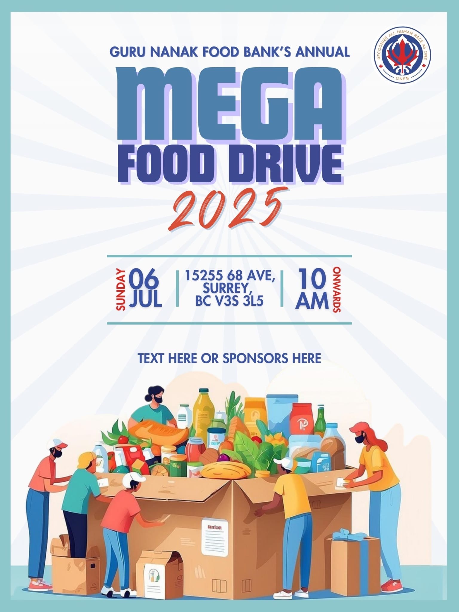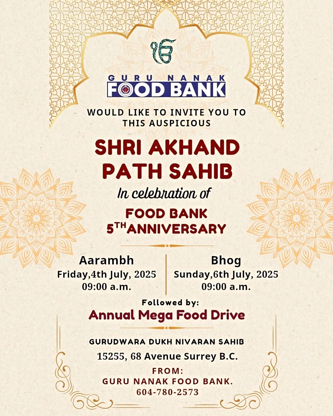 ਸਰੀ ( ਦੇ ਪ੍ਰ ਬਿ)- ਕੈਨੇਡਾ ਦੀ ਪ੍ਰਸਿੱਧ ਗੁਰੂ ਨਾਨਕ ਫੂਡ ਬੈਂਕ ਸਰੀ ਵਲੋਂ ਆਪਣੀ 5ਵੀਂ ਵਰੇਗੰਢ ਇਸ 6 ਜੁਲਾਈ ਦਿਨ ਐਤਵਾਰ ਨੂੰ ਮਨਾਈ ਜਾ ਰਹੀ ਹੈ। ਇਸ ਸਬੰਧੀ ਮੈਬਰ ਸੈਕਟਰੀ ਸ੍ਰੀ ਨੀਰਜ ਵਾਲੀਆ ਵਲੋਂ ਭੇਜੀ ਗਈ ਜਾਣਕਾਰੀ ਮੁਤਾਬਿਕ ਵਰੇਗੰਢ ਸਮਾਗਮ ਦੇ ਸਬੰਧ ਵਿਚ ਸ੍ਰੀ ਗੁਰੂ ਗਰੰਥ ਸਾਹਿਬ ਜੀ ਦੇ ਆਖੰਡ ਪਾਠ ਗੁਰਦੁਆਰਾ ਦੂਖ ਨਿਵਾਰਨ ਸਾਹਿਬ 15255, 68 ਐਵਨਿਊ ਸਰੀ ਵਿਖੇ 4 ਜੁਲਾਈ ਸ਼ੁਕਰਵਾਰ ਨੂੰ ਸਵੇਰੇ 9 ਵਜੇ ਆਰੰਭ ਹੋਣਗੇ ਜਿਹਨਾਂ ਦੇ ਭੋਗ 6 ਜੁਲਾਈ ਦਿਨ ਐਤਵਾਰ ਨੂੰ ਸਵੇਰੇ 9 ਵਜੇ ਪਾਏ ਜਾਣਗੇ। ਇਸ ਉਪਰੰਤ ਗੁਰੂ ਨਾਨਕ ਫੂਡ ਬੈਂਕ ਦੀ ਸਲਾਨਾ ਮੈਗਾ ਫੂਡ ਡਰਾਈਵ 10 ਵਜੇ ਸ਼ੁਰੂ ਹੋਵੇਗੀ। ਇਸ ਮੈਗਾ ਫੂਡ ਡਰਾਈਵ ਵਿਚ ਲੋਕਾਂ ਅਤੇ ਬਿਜਨਸ ਅਦਾਰਿਆਂ ਨੂੰ ਦਾਨ ਦੇ ਇਸ ਮਹਾਂਕੁੰਭ ਵਿਚ ਉਤਸ਼ਾਹ ਨਾਲ ਹਿੱਸਾ ਲੈਣ ਦਾ ਸੱਦਾ ਦਿੱਤਾ ਗਿਆ ਹੈ। ਵਧੇਰੇ ਜਾਣਕਾਰੀ ਲਈ ਗੁਰੂ ਨਾਨਕ ਫੂਡ ਬੈਂਕ ਨਾਲ ਫੋਨ ਨੰਬਰ 604-780-2573 ਤੇ ਸੰਪਰਕ ਕੀਤਾ ਜਾ ਸਕਦਾ ਹੈ।