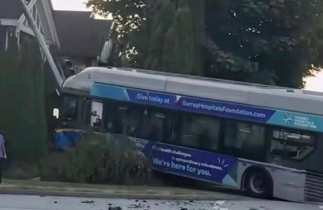 ਵੈਨਕੂਵਰ , (ਮਲਕੀਤ ਸਿੰਘ )-ਪੰਜਾਬੀਆਂ ਦੀ ਸੰਘਣੀ ਵੱਸੋਂ ਵਾਲੇ ਸਰੀ ਸ਼ਹਿਰ ਦੀ 132 ਸਟਰੀਟ ਅਤੇ 88 ਐਵਨਿਊ ਦੇ ਚੌਂਕ ਨੇੜੇ ਇੱਕ ਪਿੱਕ ਅੱਪ ਟਰੱਕ ਨਾਲ ਹਲਕੀ ਟੱਕਰ ਮਗਰੋਂ ਬੇਕਾਬੂ ਹੋਈ ਬੱਸ ਘਰ ਦੇ ਮੁੱਖ ਦਰਵਾਜ਼ੇ ਦੇ ਬਾਹਰਵਾਰ ਬਗੀਚੇ ਚ ਜਾ ਫਸੀ| ਇਸ ਹਾਦਸੇ ਸਮੇਂ ਇਸ ਬੱਸ ਵਿੱਚ ਕੋਈ ਸਵਾਰੀ ਨਹੀਂ ਸੀ ਦੱਸਿਆ ਜਾ ਰਿਹਾ ਹੈ ਕਿ ਉਕਤ ਸਟਰੀਟ ਤੋਂ ਲੰਘ ਰਹੀ ਇਸ ਬੱਸ ਦੇ ਡਰਾਈਵਰ ਵੱਲੋਂ ਇੱਕ ਪਿਕ ਅਪ ਟਰੱਕ ਨਾਲ ਟੱਕਰ ਤੋਂ ਬਚਾਅ ਕਰਦਿਆ ਇਹ ਹਾਦਸਾ ਵਾਪਰਿਆ| ਫਿਲਹਾਲ ਇਸ ਹਾਦਸੇ ਚ ਕਿਸੇ ਦੇ ਵੀ ਜਖਮੀ ਹੋਣ ਦੀ ਕੋਈ ਸੂਚਨਾ ਨਹੀਂ ਹੈ|