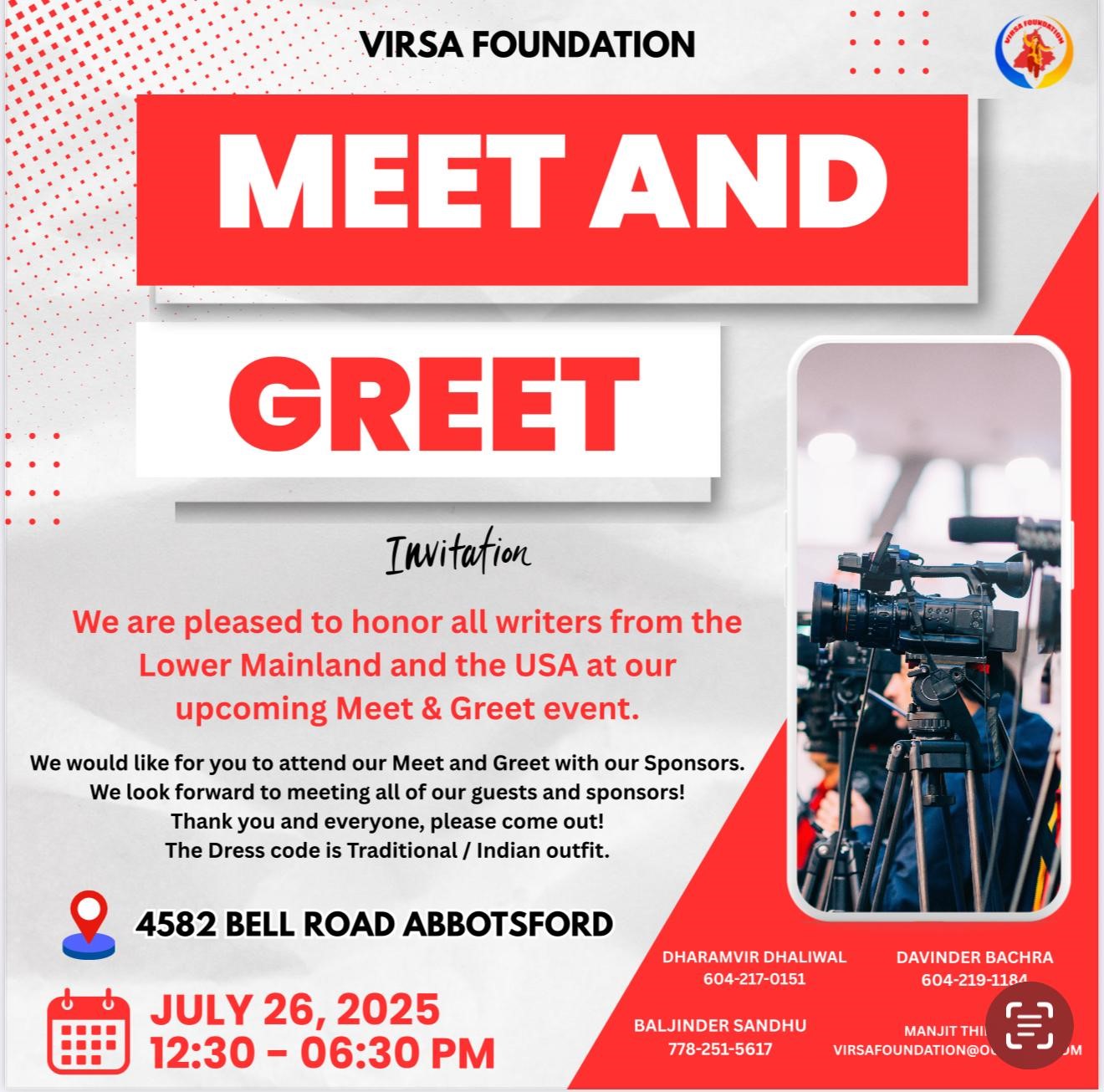 ਵੈਨਕੂਵਰ ,(ਮਲਕੀਤ ਸਿੰਘ )-ਪੰਜਾਬੀ ਸੱਭਿਆਚਾਰ ਨੂੰ ਪ੍ਰਫੁੱਲਤ ਰੱਖਣ ਲਈ ਯਤਨਸ਼ੀਲ ਵਿਰਸਾ ਫਾਊਡੇਸ਼ਨ ਵੱਲੋਂ 26 ਜੁਲਾਈ ਨੂੰ 45 82 ਬੈੱਲ ਰੋਡ ਐਬਸਫੋਰਡ ਦੇ ਖੁੱਲੇ ਖੇਤਾਂ ਦੇ ਵਿਹੜੇ ਚ ਦੁਪਹਿਰ 12:30 ਤੋਂ ਸਾਮੀ 6 30 ਵਜੇ ਤੱਕ ਮੀਟ ਅਤੇ ਗ੍ਰੀਟ ਪ੍ਰੋਗਰਾਮ ਅਯੋਜਿਤ ਕੀਤਾ ਜਾ ਰਿਹਾ ਹੈ। ਇਸ ਸਬੰਧੀ ਧਰਮਵੀਰ ਧਾਲੀਵਾਲ ਅਤੇ ਉਹਨਾਂ ਦੀ ਟੀਮ ਦੀਆਂ ਸਾਥਣਾਂ ਨੇ ਸਾਂਝੇ ਤੌਰ ਤੇ ਦੱਸਿਆ ਕਿ ਇਸ ਮੌਕੇ ਤੇ ਆਯੋਜਿਤ ਕੀਤੇ ਜਾ ਰਹੇ ਇੱਕ ਸੰਖੇਪ ਸਮਾਗਮ ਦੌਰਾਨ ਡਾ ਰਿਸ਼ੀ ਸਿੰਘ ,ਆਸਮਾ ਕਾਦਰੀ, ਹਰਪ੍ਰੀਤ ਧਾਲੀਵਾਲ ਅਤੇ ਮਨਜੀਤ ਕੌਰ ਗਿੱਲ ਦੀਆਂ ਚਾਰ ਨਵੀਆਂ ਕਿਤਾਬਾਂ ਰਿਲੀਜ਼ ਕੀਤੀਆਂ ਜਾਣਗੀਆਂ| ਇਸ ਤੋਂ ਇਲਾਵਾ ਪੰਜਾਬੀ ਵਿਰਸੇ ਚ ਅਹਿਮ ਯੋਗਦਾਨ ਪਾਉਣ ਵਾਲੀਆਂ ਕੁਝ ਪ੍ਰਮੁੱਖ ਸ਼ਖਸ਼ੀਅਤਾਂ ਨੂੰ ਸਨਮਾਨਿਤ ਵੀ ਕੀਤਾ ਜਾਵੇਗਾ।|