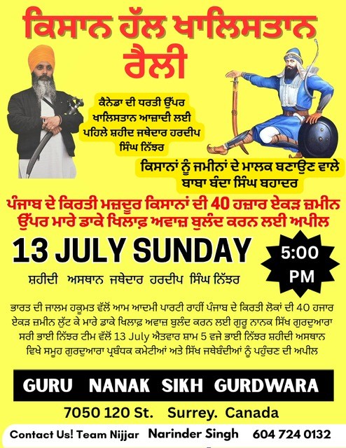 ਸਰੀ-ਭਾਰਤ ਦੀ ਹਕੂਮਤ ਵੱਲੋਂ ਆਮ ਆਦਮੀ ਪਾਰਟੀ ਰਾਹੀਂ ਪੰਜਾਬ ਦੇ ਕਿਰਤੀ ਮਜ਼ਦੂਰ ਕਿਸਾਨਾਂ ਦੀ 40 ਹਜ਼ਾਰ ਏਕੜ ਜ਼ਮੀਨ ਲੁੱਟ ਕੇ ਮਾਰੇ ਡਾਕੇ ਖਿਲਾਫ਼ ਅਵਾਜ਼ ਬੁਲੰਦ ਕਰਨ ਲਈ ਗੁਰੂ ਨਾਨਕ ਸਿੱਖ ਗੁਰਦੁਆਰਾ ਸਰੀ ਭਾਈ ਨਿੱਝਰ ਟੀਮ ਵੱਲੋਂ 13 ਜੁਲਾਈ ਐਤਵਾਰ ਸ਼ਾਮ 5 ਵਜੇ ਭਾਈ ਨਿੱਝਰ ਸ਼ਹੀਦੀ ਅਸਥਾਨ ਵਿਖੇ ਇਕੱਠ ਰੱਖਿਆ ਗਿਆ ਹੈ।ਸਮੂਹ ਗੁਰਦੁਆਰਾ ਪ੍ਰਬੰਧਕ ਕਮੇਟੀਆਂ ਅਤੇ ਸਿੱਖ ਜਥੇਬੰਦੀਆਂ ਨੂੰ ਇਸ ਇਕੱਠ ਵਿਚ ਪੁੱਜਣ ਦੀ ਅਪੀਲ ਕੀਤੀ ਗਈ ਹੈ। ਇਥੇ ਜਾਰੀ ਇਕ ਬਿਆਨ ਵਿਚ ਕਿਹਾ ਗਿਆ ਹੈ ਕਿ ਕਿਰਤੀ ਮਜ਼ਦੂਰ ਕਿਸਾਨਾਂ ਦੀ ਲੈਂਡ ਪੂਲਿੰਗ ਐਕਟ ਦੇ ਘਟੀਆ ਨੀਤੀ ਰਾਹੀਂ ਕਿਸਾਨਾਂ ਦੀ ਇਕ ਇੰਚ ਵੀ ਜ਼ਮੀਨ ਉੱਪਰ ਸਰਕਾਰ ਨੂੰ ਕਬਜ਼ਾ ਨਹੀਂ ਕਰਨ ਦਿੱਤਾ ਜਾਵੇਗਾ।