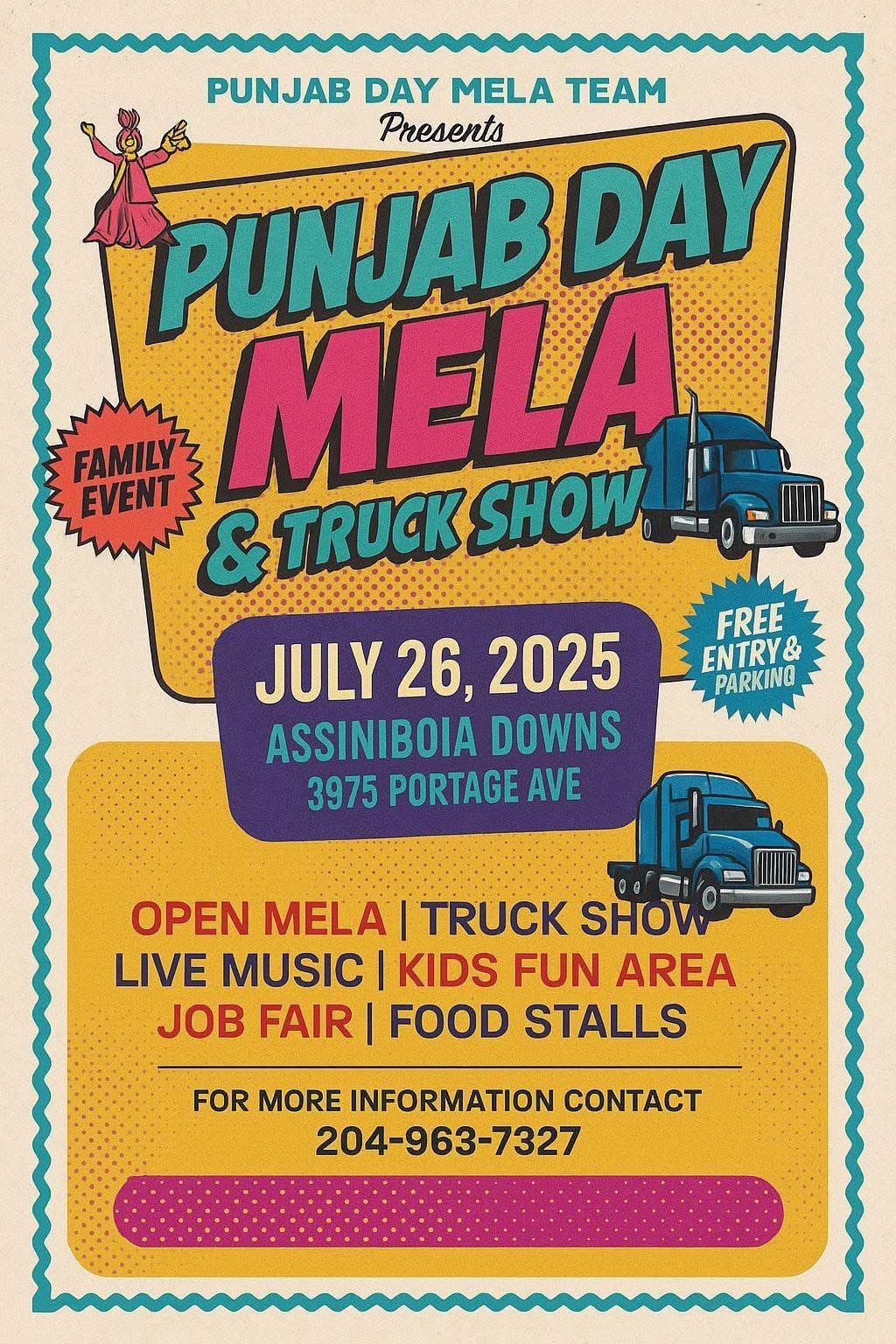 ਵਿੰਨੀਪੈਗ ( ਸ਼ਰਮਾ)- ਵਿੰਨੀਪੈਗ ਵਿਚ ਪੰਜਾਬ ਡੇਅ ਮੇਲਾ ਟੀਮ ਵਲੋਂ ਪੰਜਾਬ ਡੇਅ ਮੇਲਾ ਐਂਡ ਟਰੱਕ ਸ਼ੋਅ ਮਿਤੀ 26 ਜੁਲਾਈ 2025 ਨੂੰ ਐਸਨੀਬੋਈ ਡਾਊਨਜ਼ 3975 ਪੋਰਟੇਜ ਐਵਨਿਊ ਵਿਖੇ ਕਰਵਾਇਆ ਜਾ ਰਿਹਾ ਹੈ। ਮੇਲੇ ਦੌਰਾਨ ਲਾਈਵ ਮਿਊਜਕ ਅਤੇ ਟਰੱਕ ਸ਼ੋਅ ਹੋਵੇਗਾ ਜਿਸ ਦੌਰਾਨ ਜੌਬ ਫੇਅਰ, ਬੱਚਿਆਂ ਲਈ ਗੇਮਾਂ ਅਤੇ ਫੂਡ ਸਟਾਲ ਵਿਸ਼ੇਸ਼ ਖਿੱਚ ਦੇ ਕੇਂਦਰ ਹੋਣਗੇ। ਪਰਿਵਾਰਾਂ ਲਈ ਇਸ ਪ੍ਰੋਗਰਾਮ ਬਾਰੇ ਵਧੇਰੇ ਜਾਣਕਾਰੀ ਲਈ ਫੋਨ ਨੰਬਰ 204-963-7327 ਤੇ ਸੰਪਰਕ ਕੀਤਾ ਜਾ ਸਕਦਾ ਹੈ।
