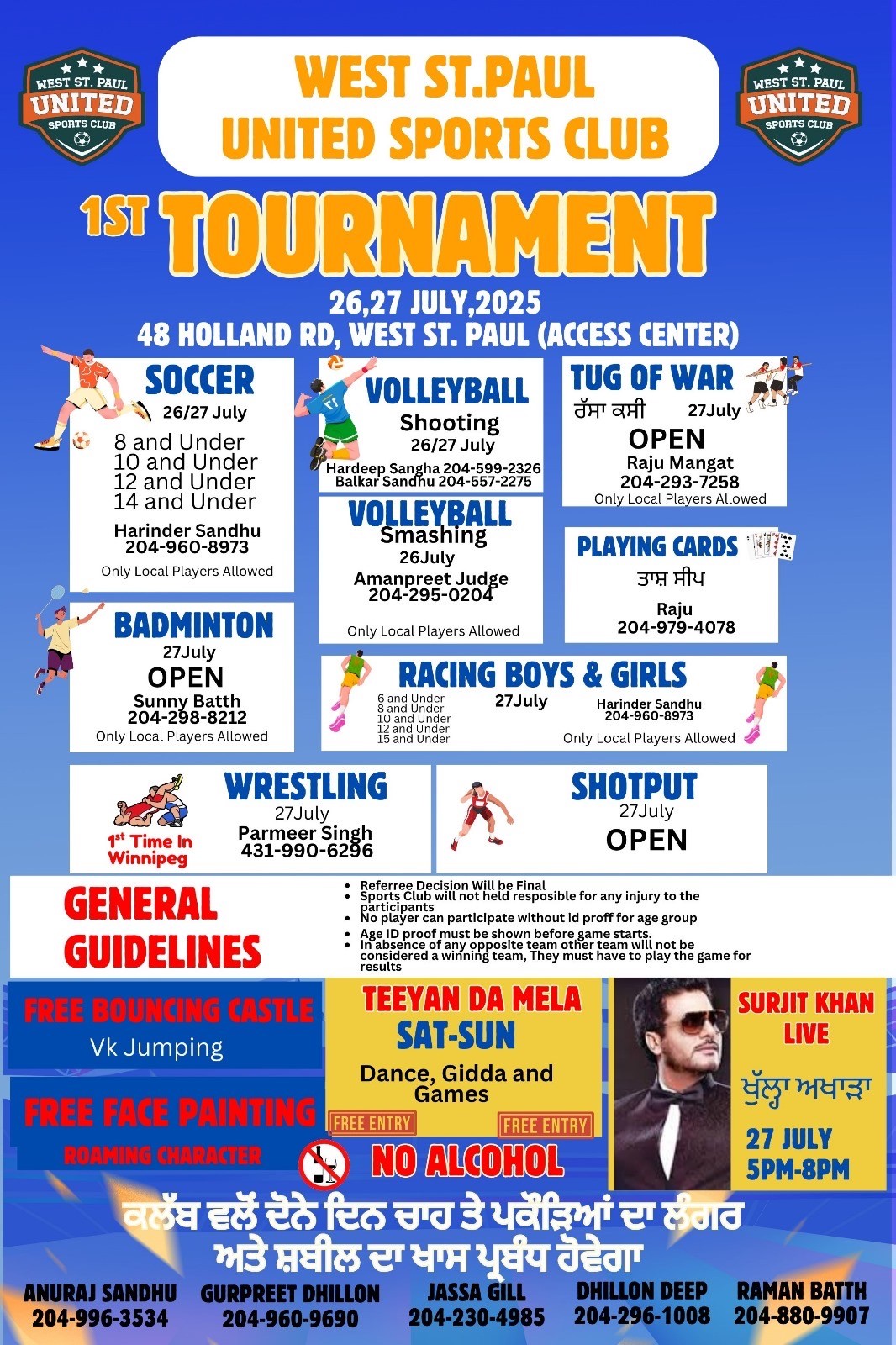 ਵਿੰਨੀਪੈਗ (ਸ਼ਰਮਾ)- ਵੈਸਟ ਸੇਂਟ ਪੌਲ ਯੁਨਾਈਟਡ ਸਪੋਰਟਸ ਕਲੱਬ ਵਲੋਂ ਪਹਿਲਾ ਟੂਰਨਾਮੈਂਟ 26-27 ਜੁਲਾਈ 2025 ਨੂੰ 48 ਹਾਲੈਂਡ ਰੋਡ ਵੈਸਟ ਸੇਂਟ ਪੌਲ ਵਿਖੇ ਕਰਵਾਇਆ ਜਾ ਰਿਹਾ ਹੈ। ਇਸ ਟੂਰਨਾਮੈਂਟ ਦੌਰਾਨ ਸੋਕਰ, ਵਾਲੀਬਾਲ ਸ਼ੂਟਿੰਗ, ਵਾਲੀਬਾਲ ਸਮੈਸ਼ਿੰਗ, ਬੈਡਮਿੰਟਨ, ਰੱਸਾਕਸ਼ੀ, ਰੈਸਲਿੰਗ, ਸ਼ਾਟਪੁੱਟ ਅਤੇ ਲੜਕੇ ਲੜਕੀਆਂ ਦੀਆਂ ਦੌੜਾਂ ਦੇ ਮੁਕਾਬਲੇ ਕਰਵਾਏ ਜਾਣਗੇ। ਸ਼ਨੀਵਾਰ ਤੇ ਐਤਵਾਰ ਤੀਆਂ ਦਾ ਮੇਲਾ ਵੀ ਲੱਗੇਗਾ ਜਿਸ ਵਿਚ 27 ਜੁਲਾਈ ਨੂੰ ਪ੍ਰਸਿਧ ਗਾਇਕ ਸੁਰਜੀਤ ਖਾਨ ਦਾ ਲਾਈਵ ਅਖਾੜਾ ਵੀ ਲੱਗੇਗਾ। ਲਾਈਵ ਪ੍ਰੋਗਰਾਮ ਸ਼ਾਮ 5 ਵਜੇ ਤੋਂ 8 ਵਜੇ ਤੱਕ ਹੋਵੇਗਾ।