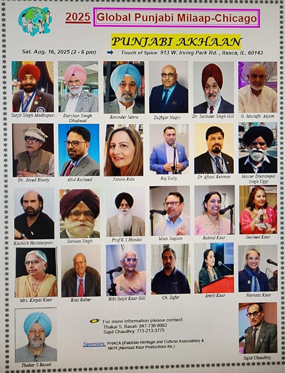 ਵਧੇਰੇ ਜਾਣਕਾਰੀ ਲਈ ਪ੍ਰੋਗਰਾਮ ਦੇ ਪ੍ਰਬੰਧਕਾਂ ਵਿਚ ਸ਼ਾਮਿਲ ਠਾਕਰ ਸਿੰਘ ਬਸਾਤੀ ਫੋਨ ਨੰਬਰ 847-736-6062, ਸਾਜਿਦ ਚੌਧਰੀ 773-213-3775, ਨਰਿੰਦਰ ਸੂਦ 847-915-0098 ਜਾਂ ਰਵਿੰਦਰ ਸਹਿਰਾਅ ਨਾਲ 219-900-1115 ਤੇ ਸੰਪਰਕ ਕੀਤਾ ਜਾ ਸਕਦਾ ਹੈ।