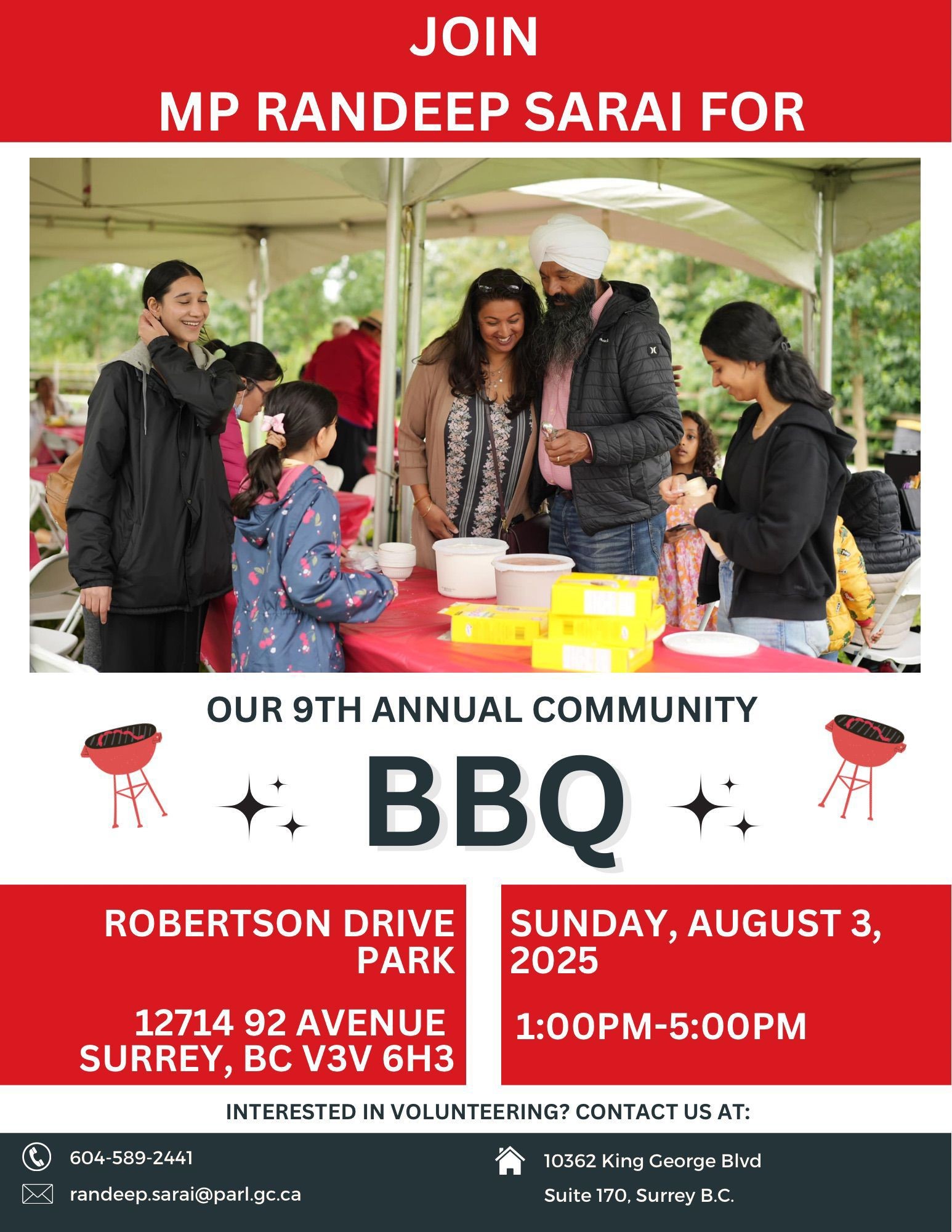 ਸਰੀ ( ਦੇ ਪ੍ਰ ਬਿ)- ਸਰੀ ਸੈਂਟਰ ਤੋਂ ਲਿਬਰਲ ਐਮ ਪੀ ਤੇ ਸਟੇਟ ਮਨਿਸਟਰ ਰਣਦੀਪ ਸਿੰਘ ਸਰਾਏ ਵਲੋਂ ਆਪਣੇ ਹਲਕੇ ਦੀ 9ਵੀਂ ਸਾਲਾਨਾ ਕਮਿਊਨਿਟੀ ਬਾਰਬੀਕਿਊ ਪਾਰਟੀ 3 ਅਗਸਤ ਦਿਨ ਐਤਵਾਰ ਨੂੰ ਦੁਪਹਿਰ 1 ਤੋਂ ਸ਼ਾਮ 5 ਵਜੇ ਤੱਕ ਰੋਬਰਟਸਨ ਡਰਾਈਵ ਪਾਰਕ 12714-92 ਐਵਨਿਊ ਵਿਖੇ ਕੀਤੀ ਜਾ ਰਹੀ ਹੈ। ਉਹਨਾਂ ਸਮੂਹ ਹਲਕਾ ਵਾਸੀਆਂ, ਵੋਟਰਾਂ ਤੇ ਆਪਣੇ ਸਮਰਥਕਾਂ ਨੂੰ ਹੁੰਮਹੁਮਾਕੇ ਪੁੱਜਣ ਦੀ ਅਪੀਲ ਕੀਤੀ ਹੈ। ਵਧੇਰੇ ਜਾਣਕਾਰੀ ਲਈ ਫੋਨ ਨੰਬਰ 604-589-2441 ਤੇ ਸੰਪਰਕ ਕੀਤਾ ਜਾ ਸਕਦਾ ਹੈ।