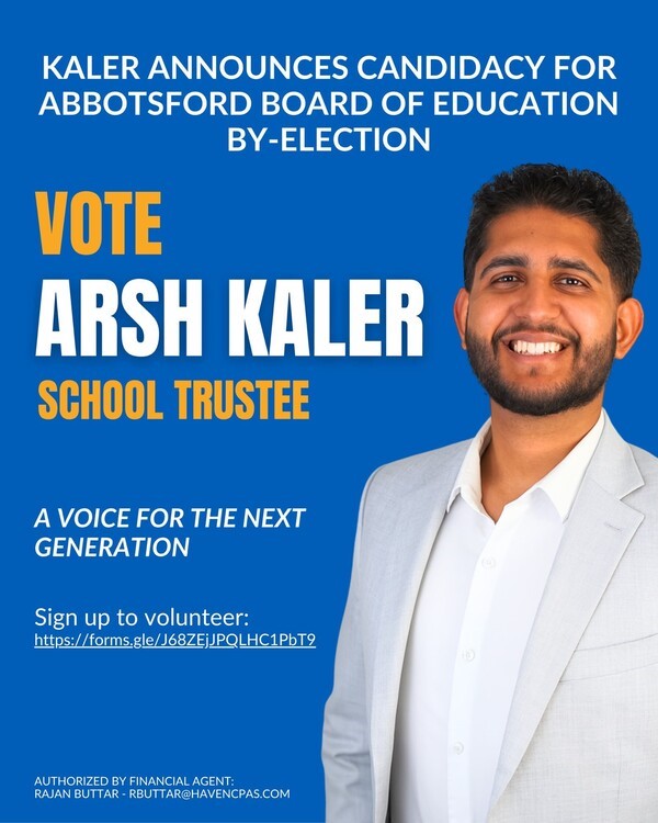 ਐਬਸਫੋਰਡ ( ਦੇ ਪ੍ਰ ਬਿ)- ਐਬਸਫੋਰਡ ਵੈਸਟ ਤੋਂ ਕੰਸਰਵੇਟਿਵ ਐਮ ਐਲ ਏ ਕੋਰਕੀ ਨਿਊਫੈਲਡ ਵਲੋਂ ਐਬਸਫੋਰਡ ਸਕੂਲ ਬੋਰਡ ਦੇ ਟਰੱਸਟੀ ਵਜੋਂ ਅਸਤੀਫਾ ਦੇਣ ਉਪਰੰਤ ਹੁਣ ਉਹਨਾਂ ਦੀ ਥਾਂ ਸਕੂਲ ਟਰੱਸਟੀ ਲਈ ਉਪ ਚੋਣ 11 ਅਕਤੂਬਰ ਨੂੰ ਹੋਣ ਜਾ ਰਹੀ ਹੈ। ਜਿ਼ਕਰਯੋਗ ਹੈ ਕਿ ਬੀਸੀ ਲੈਜਿਸਲੇਚਰ ਵਲੋਂ 27 ਮਈ ਨੂੰ ਪਾਸ ਕੀਤੇ ਬਿਲ ਕਿ ਕੋਈ ਵੀ ਵਿਧਾਇਕ ਦੋ ਅਹੁਦੇ ਨਹੀ ਰੱਖ ਸਕਦਾ, ਦੇ ਕਨੂੰਨ ਬਣਨ ਉਪਰੰਤ ਉਹਨਾਂ ਨੂੰ ਸਕੂਲ ਟਰੱਸਟੀ ਦੇ ਅਹੁਦੇ ਤੋਂ ਅਸਤੀਫਾ ਦੇਣਾ ਪਿਆ ਹੈ। ਸਕੂਲ ਟਰੱਸਟੀ ਦੀ ਉਪ ਚੋਣ ਲਈ ਸ਼ਹਿਰ ਵਿਚ ਸਰਗਰਮੀਆਂ ਸ਼ੁਰੂ ਹੋ ਗਈਆਂ ਹਨ। ਐਬਸਫੋਰਡ ਦੇ ਜੰਮਪਲ ਹੋਣਹਾਰ ਪੰਜਾਬੀ ਨੌਜਵਾਨ ਅਰਸ਼ ਕਲੇਰ ਵਲੋਂ ਚੋਣ ਲੜਨ ਦਾ ਐਲਾਨ ਕੀਤਾ ਗਿਆ ਹੈ।
