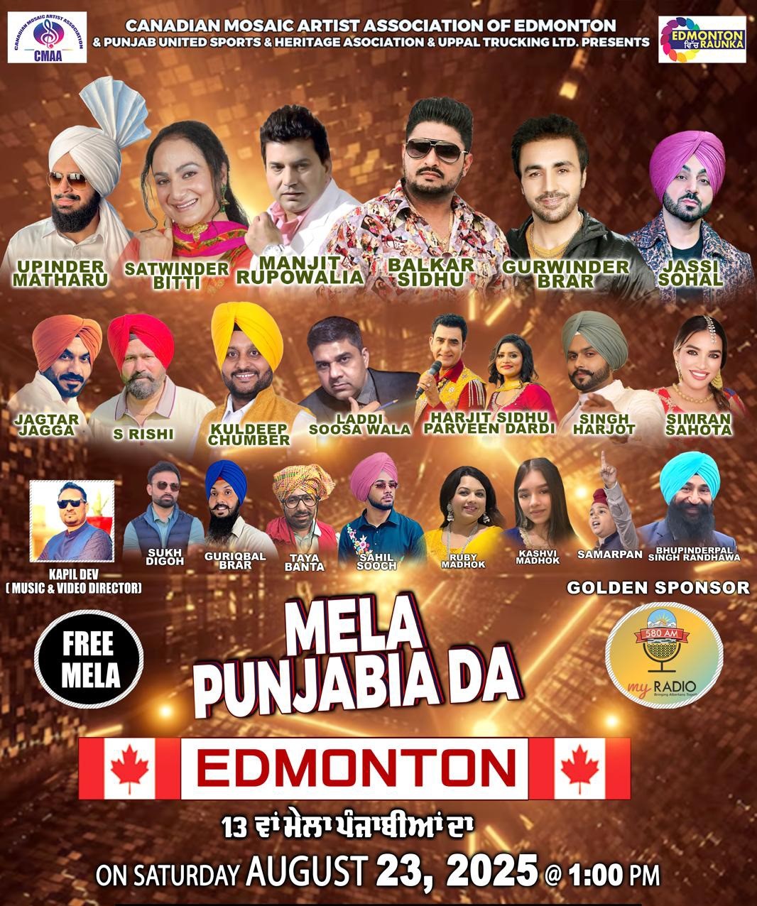 ਸਰੀ/ ਵੈਨਕੂਵਰ (ਕੁਲਦੀਪ ਚੁੰਬਰ)- ਤੇਰ੍ਹਵਾਂ ‘ਮੇਲਾ ਪੰਜਾਬੀਆਂ ਦਾ’ ਐਡਮਿੰਟਨ ਕਨੇਡਾ ਵਿੱਚ ਹਰ ਸਾਲ ਦੀ ਤਰ੍ਹਾਂ ਧੂਮ ਧਾਮ ਨਾਲ 23 ਅਗਸਤ 2025 ਦਿਨ ਸ਼ਨੀਵਾਰ ਦੁਪਹਿਰ 1 ਵਜੇ ਤੋਂ ਪੂਸ਼ਾ ਦੀਆਂ ਗਰਾਊਂਡਾਂ ਵਿੱਚ ਹਰ ਵਰ੍ਹੇ ਦੀ ਤਰ੍ਹਾਂ ਧੂਮਧਾਮ ਨਾਲ ਕਰਵਾਇਆ ਜਾ ਰਿਹਾ ਹੈ। ਐਡਮਿੰਟਨ ਕਨੇਡਾ ਵਿੱਚ ਫਰੀ ਮੇਲਾ ਕਰਵਾਉਣ ਦੀਆਂ ਤਿਆਰੀਆਂ ਸਾਰੇ ਪ੍ਰਬੰਧਕਾਂ ਵਲੋਂ ਪੂਰੇ ਸ਼ਾਨੋ ਸ਼ੌਕਤ ਨਾਲ ਕੀਤੀਆਂ ਗਈਆਂ ਹਨ । ਐਡਮਿੰਟਨ ਵਾਸੀਆਂ ਨੂੰ ਇਸ ਮੇਲੇ ਵਿੱਚ ਹਰ ਸਾਲ ਦੀ ਤਰ੍ਹਾਂ ਖੁੱਲ੍ਹਾ ਸੱਦਾ ਹੈ ਅਤੇ ਪਰਿਵਾਰਾਂ ਸਮੇਤ ਇਸ ਮੇਲੇ ਦੀ ਰੌਣਕ ਨੂੰ ਵਧਾਉਣ ਦੀ ਬੇਨਤੀ ਪ੍ਰਬੰਧਕ ਵੀਰਾਂ ਨੇ ਸਭ ਸ਼ਹਿਰੀਆਂ ਨੂੰ ਕੀਤੀ ਹੈ । ਕਨੇਡੀਅਨ ਮੋਜਾਇਕ ਆਰਟਿਸਟ ਐਸੋਸੀਏਸ਼ਨ ,ਐਡਮਿੰਟਨ ਪੰਜਾਬ ਯੂਨਾਈਟਡ ਸਪੋਰਟਸ ਅਤੇ ਹੈਰੀਟੇਜ ਐਸੋਸੀਏਸ਼ਨ ਐਂਡ ਓਪਲ ਟਰੱਕਿੰਗ ਲਿਮਿਟਡ ਇਸ ਮੇਲੇ ਦੇ ਪੇਸ਼ਕਾਰ ਹਨ। ਮੇਲੇ ਵਿੱਚ ਇਸ ਵਾਰ ਵਿਸ਼ੇਸ਼ ਤੌਰ ਤੇ ਉਪਿੰਦਰ ਮਠਾਰੂ, ਬਲਕਾਰ ਸਿੱਧੂ, ਸਤਵਿੰਦਰ ਬਿੱਟੀ, ਮਨਜੀਤ ਰੂਪੋਵਾਲੀਆ, ਬਲਕਾਰ ਸਿੱਧੂ, ਗੁਰਵਿੰਦਰ ਬਰਾੜ, ਜੱਸੀ ਸੋਹਲ, ਜਗਤਾਰ ਜੱਗਾ, ਐਸ ਰਿਸ਼ੀ, ਕੁਲਦੀਪ ਚੁੰਬਰ, ਲਾਡੀ ਸੂਸਾਂ ਵਾਲਾ (ਗੀਤਕਾਰ ਤੇ ਸਟੇਜ ਸੰਚਾਲਕ), ਹਰਜੀਤ ਸਿੱਧੂ ਤੇ ਪਰਵੀਨ ਦਰਦੀ ਦੋਗਾਣਾ ਜੋੜੀ, ਸਿੰਘ ਹਰਜੋਤ, ਸਿਮਰਨ ਸਹੋਤਾ, ਕਪਿਲ ਦੇਵ ਮਿਊਜਿਕ ਐਂਡ ਵੀਡੀਓ ਡਾਇਰੈਕਟਰ, ਸੁੱਖ ਦੀਗੋਹ, ਗੁਰਇਕਬਾਲ ਬਰਾੜ, ਤਾਇਆ ਬੰਤਾ, ਸਾਹਿਲ ਸੂਚ, ਰੂਬੀ ਮਦਹੋਕ, ਕਾਸ਼ਵੀ ਮਦਹੋਕ, ਸ਼ਾਮਾਰਪਨ, ਭੁਪਿੰਦਰ ਪਾਲ ਸਿੰਘ ਰੰਧਾਵਾ ਵਿਸ਼ੇਸ਼ ਤੌਰ ਤੇ ਆਪਣੀ ਗਾਇਕੀ ਦਾ ਪ੍ਰਦਰਸ਼ਨ ਕਰਨਗੇ ਅਤੇ ਸਰੋਤਿਆਂ ਨੂੰ ਮੰਤਰ ਮੁਗਧ ਕਰਨਗੇ । ਪੂਸ਼ਾ ਗਰਾਊਂਡਾਂ ਵਿੱਚ ਹਰ ਸਾਲ ਦੀ ਤਰ੍ਹਾਂ ਇਹ ਮੇਲਾ ਮਨਾਇਆ ਜਾਵੇਗਾ। ਇਸ ਮੇਲੇ ਨੂੰ ਪ੍ਰਮੋਟ ਕਰਨ ਲਈ ਸਾਰੇ ਹੀ ਪਹੁੰਚ ਰਹੇ ਆਰਟਿਸਟਾਂ ਵਲੋਂ ਆਪਣੀਆਂ ਵੱਖ ਵੱਖ ਸੋਸ਼ਲ ਸਾਈਟਾਂ ਤੇ ਦਰਸ਼ਕਾਂ ਨੂੰ ਮੇਲੇ ਵਿੱਚ ਸ਼ਾਮਲ ਹੋਣ ਦਾ ਸੱਦਾ ਆਪਣੇ ਆਪਣੇ ਅੰਦਾਜ਼ ਵਿੱਚ ਦਿੱਤਾ ਜਾ ਰਿਹਾ ਹੈ।