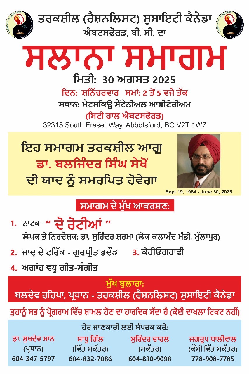 ਸਰੀ, 25 ਅਗਸਤ (ਹਰਦਮ ਮਾਨ)-ਤਰਕਸ਼ੀਲ (ਰੈਸ਼ਨਲਿਸਟ) ਸੁਸਾਇਟੀ ਕਨੇਡਾ ਐਬਸਫੋਰਡ (ਬੀਸੀ) ਵੱਲੋਂ ਆਪਣਾ ਸਲਾਨਾ ਸਮਾਗਮ 30 ਅਗਸਤ 2025 (ਸਨਿੱਚਰਵਾਰ) ਦੁਪਹਿਰ 2 ਵਜੇ ਤੋਂ  ਮੈਟਸਕਿਊ ਸੈਂਟੇਨੀਅਲ ਆਡੀਟੋਰੀਅਮ (ਸਿਟੀ ਹਾਲ ਐਬਸਫੋਰਡ) ਵਿਖੇ ਕਰਵਾਇਆ ਜਾ ਰਿਹਾ ਹੈ। ਇਹ ਜਾਣਕਾਰੀ ਦਿੰਦਿਆਂ ਸੁਸਾਇਟੀ ਦੇ ਸਕੱਤਰ ਸੁਰਿੰਦਰ ਚਾਹਲ ਨੇ ਦੱਸਿਆ ਹੈ ਕਿ ਇਹ ਸਮਾਗਮ ਪਿਛਲੇ ਦਿਨੀਂ ਸਦੀਵੀ ਵਿਛੋੜਾ ਦੇ ਗਏ ਤਰਕਸ਼ੀਲ ਆਗੂ ਡਾਕਟਰ ਬਲਜਿੰਦਰ ਸਿੰਘ ਸੇਖੋਂ ਦੀ ਯਾਦ ਨੂੰ ਸਮਰਪਿਤ ਹੋਵੇਗਾ।