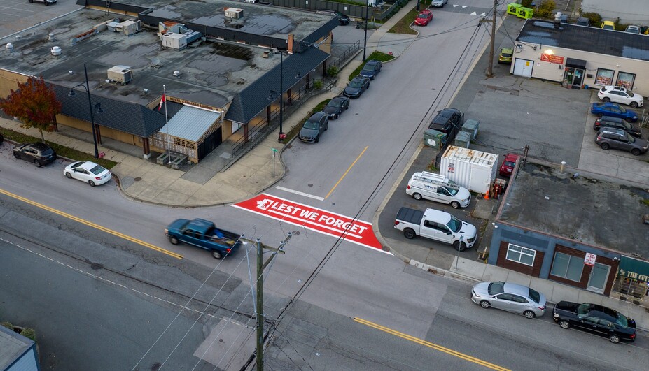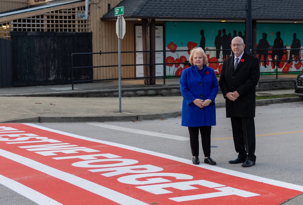 ਸਰੀ ( ਕਾਹਲੋਂ)- – ਕੈਨੇਡਾ ਦੇ ਵੈਟਰਨਜ਼ ਭਾਵ ਸੈਨਿਕਾਂ ਨੂੰ ਸ਼ਰਧਾਂਜਲੀ ਦੇਣ ਲਈ, ਸਰੀ ਸ਼ਹਿਰ ਨੇ ਕਲੋਵਰਡੇਲ ਦੇ 17500-ਬਲਾਕ 57 ਐਵੇਨਿਊ ‘ਤੇ ਰੋਇਲ ਕੈਨੇਡੀਅਨ ਲੀਜਨ ਦੇ ਨੇੜੇ ਇੱਕ ਨਵਾਂ ਯਾਦਗਾਰੀ ਕ੍ਰਾਸਵਾਕ ਦਾ ਉਦਘਾਟਨ ਕੀਤਾ ਹੈ। ਇਹ ਕ੍ਰਾਸਵਾਕ ਲਾਲ ਅਤੇ ਚਿੱਟੇ ਰੰਗ ਵਿੱਚ ਰੰਗਿਆ ਗਿਆ ਹੈ, ਜਿਸਤੇ ਇੱਕ ਨਮਸਕਾਰ ਕਰਦੇ ਸਿਪਾਹੀ ਦਾ ਪਰਛਾਵਾਂ, ਇੱਕ ਮੇਪਲ ਪੱਤਾ ਅਤੇ “ਲੈਸਟ ਵੀ ਫਰਗੈਟ” (Lest We Forget) ਦੇ ਸ਼ਬਦ ਦਰਸਾਏ ਗਏ ਹਨ।