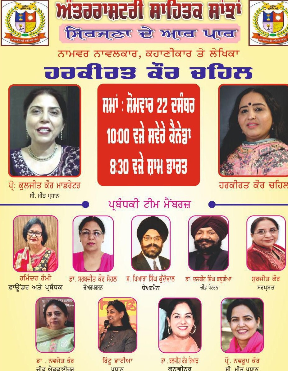 ਅੰਤਰਰਾਸ਼ਟਰੀ ਪੰਜਾਬੀ ਸਾਹਿਤ ਨੂੰ ਜੋੜਨ ਅਤੇ ਸਰਹੱਦਾਂ ਤੋਂ ਪਾਰ ਸਾਂਝੀ ਸਿਰਜਣਾ ਨੂੰ ਉਤਸ਼ਾਹਿਤ ਕਰਨ ਦੇ ਉਦੇਸ਼ ਨਾਲ ਅੰਤਰਰਾਸ਼ਟਰੀ ਸਾਹਿਤਿਕ ਸਾਂਝਾਂ, ਬਰੈਂਪਟਨ (ਕੈਨੇਡਾ) ਵੱਲੋਂ ਮਹੀਨਾਵਾਰ ਵਿਸ਼ੇਸ਼ ਸਾਹਿਤਕ ਪ੍ਰੋਗਰਾਮ ‘ਸਿਰਜਣਾ ਦੇ ਆਰ–ਪਾਰ’ ਦਾ ਔਨਲਾਈਨ ਆਯੋਜਨ 22 ਦਸੰਬਰ ਸੋਮਵਾਰ ਨੂੰ ਕੀਤਾ ਗਿਆ।ਇਹ ਪ੍ਰੋਗਰਾਮ ਸੰਸਥਾ ਦੀ ਸੰਸਥਾਪਕ ਤੇ ਪ੍ਰਬੰਧਕ ਰਮਿੰਦਰ ਰੰਮੀ ਦੇ ਵਿਸ਼ੇਸ਼ ਯਤਨਾਂ ਅਤੇ ਸਾਹਿਤ ਪ੍ਰਤੀ ਸਮਰਪਿਤ ਦ੍ਰਿਸ਼ਟੀ ਦਾ ਨਤੀਜਾ ਸੀ। ਪ੍ਰੋਗਰਾਮ ਦੇ ਆਰੰਭ ਵਿਚ ਡਾ. ਸਰਬਜੀਤ ਕੌਰ ਸੋਹਲ ਚੇਅਰਪਰਸਨ ਅੰਤਰਰਾਸ਼ਟਰੀ ਸਾਹਿਤਿਕ ਸਾਂਝਾਂ ਨੇ ਵਿਸ਼ੇਸ਼ ਸ਼ਖਸੀਅਤ ਹਰਕੀਰਤ ਕੌਰ ਚਹਿਲ ਨੂੰ ਨਿੱਘੀ ਜੀ ਆਇਆਂ ਆਖਦਿਆਂ ਉਨ੍ਹਾਂ ਨੂੰ ਸਾਹਿਤ ਨੂੰ ਸਮਰਪਿਤ ਸ਼ਖਸੀਅਤ ਦੱਸਿਆ। ਡਾ. ਸੋਹਲ ਨੇ ਹਰਕੀਰਤ ਕੌਰ ਚਹਿਲ ਜੀ ਬਾਰੇ ਆਪਣੇ ਨਿੱਜੀ ਅਨੁਭਵ ਸਾਂਝੇ ਕਰਦਿਆਂ ਉਨ੍ਹਾਂ ਨੂੰ ਪ੍ਰੋੜ ਗਲਪੀ ਲੇਖਿਕਾ ਦੇ ਤੌਰ ਤੇ ਵਿਸ਼ੇਸ਼ ਹਸਤਾਖ਼ਰ ਦੱਸਿਆ। ਉਨ੍ਹਾਂ ਦੀਆਂ ਰਚਨਾਵਾਂ ਦੇ ਸਮਾਜਿਕ ਸਰੋਕਾਰਾਂ ਦੀ ਗੱਲ ਕੀਤੀ। ਉਪਰੰਤ ਰਮਿੰਦਰ ਰੰਮੀ ਨੇ ਵੀ ਹਰਕੀਰਤ ਚਹਿਲ ਜੀ ਨੂੰ ਜੀ ਆਇਆਂ ਆਖਿਆ ਅਤੇ ਉਨ੍ਹਾਂ ਦੀਆਂ ਲਿਖਤਾਂ ਨੂੰ ਪੰਜਾਬੀ ਸਾਹਿਤ ਦਾ ਮਾਣ ਦੱਸਿਆ।