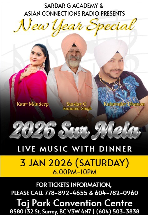 ਵੈਨਕੂਵਰ,24 ਦਸੰਬਰ (ਮਲਕੀਤ ਸਿੰਘ)-ਸਰਦਾਰ ਜੀ ਅਕੈਡਮੀ ਅਤੇ ਏਸ਼ੀਅਨ ਕਨੈਕਸ਼ਨ ਰੇਡੀਓ ਸਮੂਹ ਵੱਲੋਂ ਪੰਜਾਬੀ ਭਾਈਚਾਰੇ ਦਾ ਸਹਿਯੋਗ ਨਾਲ 3 ਜਨਵਰੀ ਨੂੰ ਸਰੀ ਦੀ 132 ਸਟਰੀਟ ਤੇ ਸਥਿਤ ਤਾਜ ਪਾਰਕ ਕਨਵੈਂਸ਼ਨ ਸੈਂਟਰ ਵਿੱਚ ਸ਼ਾਮੀ 6 ਵਜੇ ਤੋਂ ਰਾਤ 10 ਵਜੇ ਤੱਕ ਸੁਰ ਮੇਲਾ ਆਯੋਜਿਤ ਕਰਵਾਇਆ ਜਾ ਰਿਹਾ ਹੈ। ਅਤੇ ਸਬੰਧੀ ਲੋੜਦੀਆਂ ਤਿਆਰੀਆਂ ਮੁਕੰਮਲ ਹੋ ਚੁੱਕੀਆਂ ਹਨ ਉੱਘੇ ਨੌਜਵਾਨ ਗਾਇਕ ਕੁਲਵਿੰਦਰ ਧਨੋਆ ਨੇ ਸੰਬੰਧੀ ਜਾਣਕਾਰੀ ਸਾਂਝੀ ਕਰਦਿਆਂ ਦੱਸਿਆ ਕਿ ਲਗਾਤਾਰ ਤਿੰਨ ਘੰਟੇ ਨਿਰੰਤਰ ਚੱਲਣ ਵਾਲੇ ਸੁਰ ਮੇਲੇ ਚ ਸੁਰੰਗੀ ਕੂਇਨ ਵਜੋਂ ਜਾਣੀ ਜਾਂਦੀ ਕੌਰ ਮਨਦੀਪ,ਗਾਇਕ ਕਰਨਵੀਰ ਸਿੰਘ (ਸਰਦਾਰ ਜੀ)ਅਤੇ ਉਹ ਖੁਦ ਆਪਣੇ ਚੋਣਵੇਂ ਗੀਤਾਂ ਦੀ ਪੇਸ਼ਕਾਰੀ ਕਰਕੇ ਹਾਜ਼ਰ ਸਰੋਤਿਆਂ ਦਾ ਮਨੋਰੰਜਨ ਕਰਨਗੇ ਅਖੀਰ ਚ ਉਹਨਾਂ ਨੇ ਇਹ ਵੀ ਦੱਸਿਆ ਕਿ ਇਸ ਮੇਲੇ ਚ ਸ਼ਾਮਿਲ ਹੋਣ ਦੇ ਚਾਹਵਾਨ ਫੋਨ 778 8924655 ਜਾਂ 604 782 0960 ਤੇ ਸੰਪਰਕ ਕਰ ਸਕਦੇ ਹਨ