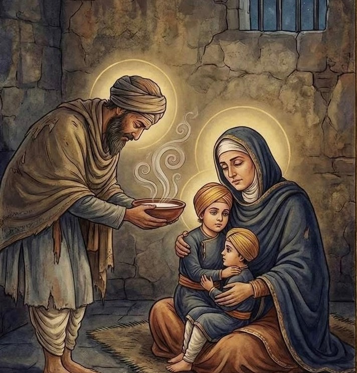 ਧੰਨ ਧੰਨ ਮਾਤਾ ਗੁਜਰੀ ਜੀ ਅਤੇ ਛੋਟ ਸਾਹਿਬਜਾਦਿਆ ਬਾਬਾ ਜ਼ੋਰਾਵਰ ਸਿੰਘ ਜੀ ਅਤੇ ਬਾਬਾ ਫਤਿਹ ਸਿੰਘ ਜੀ ਨੂੰ ਜਦੋਂ ਮੋਰਿੰਡਾ ਦੇ ਕੋਤਵਾਲ ਨੇ ਗੰਗੂ ਬ੍ਰਾਹਮਣ ਦੀ ਸ਼ਿਕਾਇਤ ਤੇ ਗ੍ਰਿਫਤਾਰ ਕਰਕੇ ਸਰਹਿੰਦ ਦੇ ਨਵਾਬ ਵਜ਼ੀਰ ਖਾਂ ਅੱਗੇ ਪੇਸ਼ ਕੀਤੇ ਤਾਂ ਮਾਤਾ ਜੀ ਅਤੇ ਸਾਹਿਬਜ਼ਾਦਿਆਂ ਨੂੰ ਠੰਡੇ ਬੁਰਜ ਵਿੱਚ ਰੱਖਿਆ ਗਿਆ।