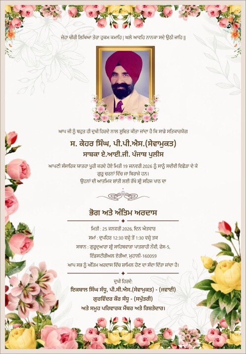 ਜਲੰਧਰ ( ਦੇ ਪ੍ਰ ਬਿ)– ਸੁਰਜੀਤ ਹਾਕੀ ਸੁਸਾਇਟੀ ਜਲੰਧਰ ਦੇ ਪ੍ਰਬੰਧਕੀ ਸਕੱਤਰ ਅਤੇ ਸਾਬਕਾ ਪੀ ਸੀ ਐਸ ਅਧਿਕਾਰੀ ਸ ਇਕਬਾਲ ਸਿੰਘ ਸੰਧੂ ਦੀ ਧਰਮ ਪਤਨੀ ਸ੍ਰੀਮਤੀ ਗੁਰਵਿੰਦਰ ਕੌਰ ਸੰਧੂ ਦੇ ਸਤਿਕਾਰਯੋਗ ਪਿਤਾ ਸ ਕੇਹਰ ਸਿੰਘ ਸਾਬਕਾ ਏ ਆਈ ਜੀ ਪੰਜਾਬ ਪੁਲਿਸ ਜੋ ਪਿਛਲੇ ਦਿਨੀਂ ਸਦੀਵੀ ਵਿਛੋੜਾ ਦੇ ਗਏ ਸਨ, ਵਲੋਂ ਦੁਖੀ ਹਿਰਦੇ ਨਾਲ ਸੂਚਿਤ ਕੀਤਾ ਗਿਆ ਹੈ ਕਿ ਸਵਰਗੀ ਸ ਕੇਹਰ ਸਿੰਘ ਨਮਿਤ ਪਾਠ ਦਾ ਭੋਗ ਤੇ ਅੰਤਿਮ ਅਰਦਾਸ 25 ਜਨਵਰੀ ਦਿਨ ਐਤਵਾਰ ਨੂੰ ਦੁਪਹਿਰ 12.30 ਤੋਂ 1.30ਵਜੇ ਤੱਕ ਗੁਰਦੁਆਰਾ ਸ੍ਰੀ ਸਾਹਿਬਵਾੜਾ ਪਾਤਸ਼ਾਹੀ ਨੌਵੀਂ ਫੇਸ-5, ਇੰਡਸਟਰੀਅਲ ਏਰੀਆ ਮੁਹਾਲੀ ਵਿਖੇ ਹੋਵੇਗੀ। ਪਰਿਵਾਰ ਵਲੋਂ ਸਮੂਹ ਰਿਸ਼ਤੇਦਾਰਾਂ ਤੇ ਭਾਈਚਾਰੇ ਨੂੰ ਅੰਤਿਮ ਅਰਦਾਸ ਵਿਚ ਸ਼ਾਮਿਲ ਹੋਣ ਦੀ ਬੇਨਤੀ ਕੀਤੀ ਗਈ ਹੈ।